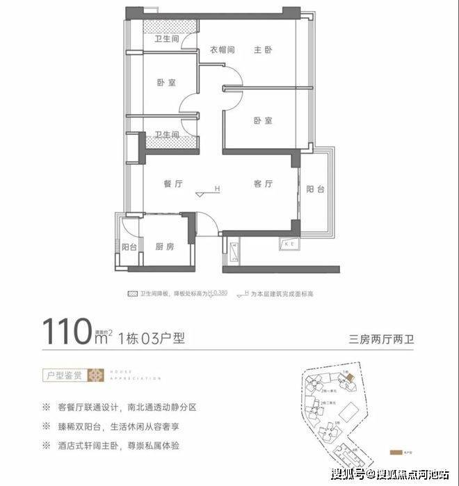 110㎡三房两厅二卫:该户型为南北通透双阳台设计,主朝向东南,冬暖夏凉。分布在1栋03,仅一条腿,按照目前的周边情况,超过25米(9F)以上视野开阔。