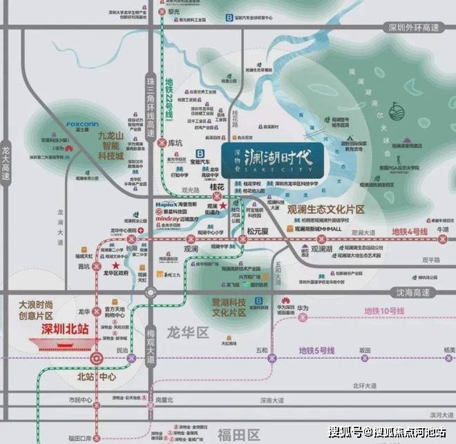 澜湖时代位于龙华桂花路和观光路交汇处的北面,正好处于“梅观创新产业走廊”和“观澜河生态走廊”两大都市走廊的交汇节点上,融汇“产业”与“生态”两大特色要素。