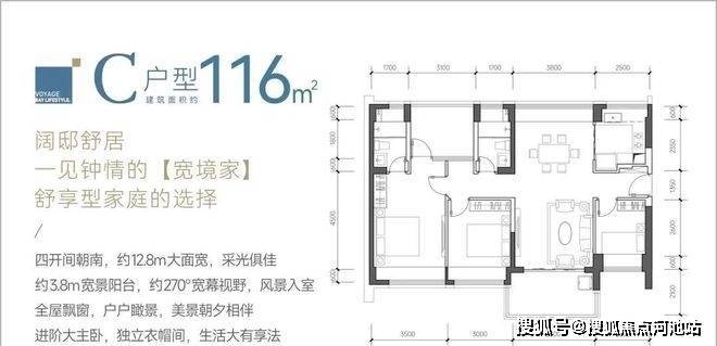 116㎡的4房2厅2卫,C户型,设计的是竖厅南北通透格局,餐客厅一体化设计,客厅3.8米开间,四开间朝南,4个卧室分别做到了主卧17.85㎡/次卧11.4㎡/次卧9.3㎡/次卧8㎡(包含墙体飘窗),都不用搭配飘窗做床,U型厨房,卫生间干湿分离,得房率约:93.13%(包含赠送),阳台主朝西南、东南或正南向。