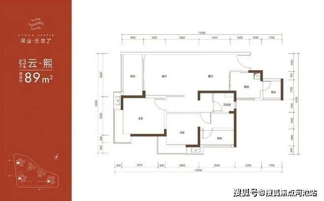 89㎡的3房2厅1卫,E2户型,设计的是竖厅格局,客厅3.6米开间,LDKB一体化设计,3个卧室分别做到了主卧13.5㎡/次卧9.54㎡/次卧8.1㎡(含墙体飘窗),L型厨房还带1个小生活阳台,卫生间三段式分离,得房率:79.89%(不含赠送),东南/西南或正南朝向。