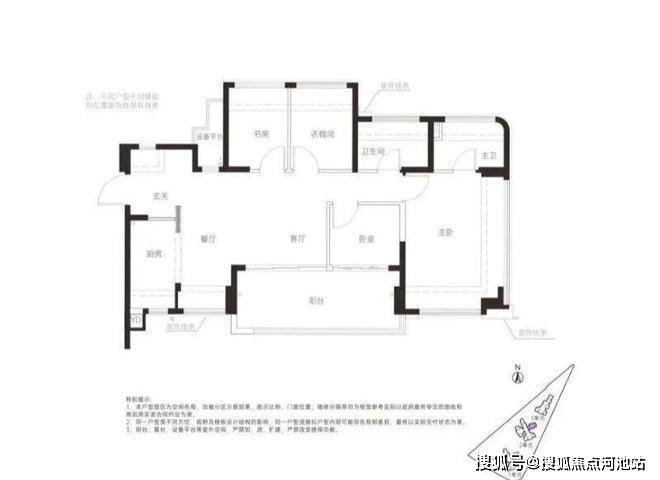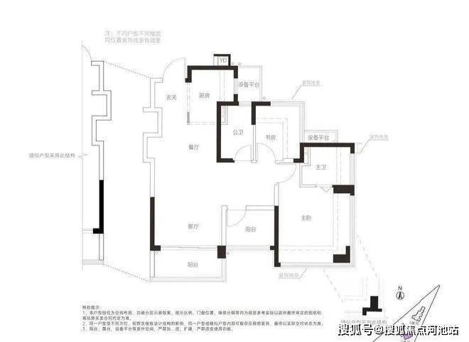 84㎡的3房2厅2卫,设计的是横厅南北通透格局,客厅3.4米开间,LDKG+X空间一体化,动静分区,主卧南北通设计,餐厅位带1个设备平台,U型厨房,卫生间干湿分离,得房率:100%(包含赠送),阳台东北朝向。