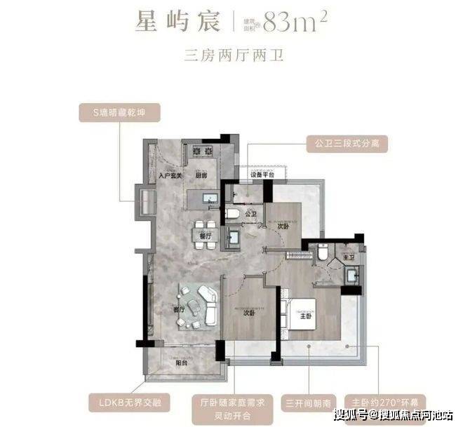 83㎡的3房2厅2卫,设计的是经典竖厅格局,客厅3.35米开间,LDKB一体化,S墙设计预留双开门冰箱卡槽位,三开间朝南,动静分区,U型厨房,公卫三段式干湿分离,赠送1.98平设备平台,得房率约77.15%(不含赠送),阳台5.02m²西南或东南朝向。靓点:83平做到了3房2卫,主卧270°无柱转角飘窗,厨房烟道外置+额外赠送设备平台,并且是纯南向格局。