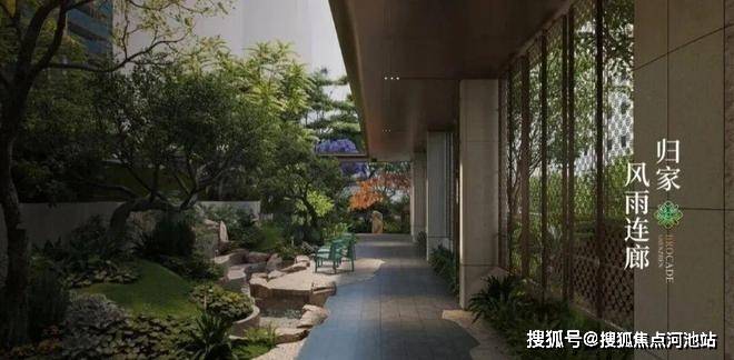 风雨连廊的链接,如一条串联绿城生活的珍珠项链,在“流光溢彩”的氛围中,将绿植水景、休憩平台一一相连,塑造移步异景的立体生态廊道。