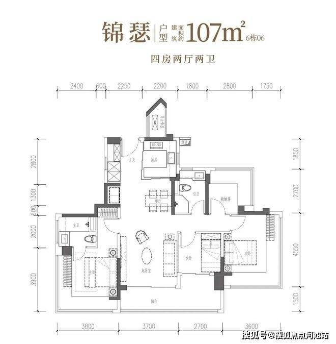 107㎡的4房2厅2卫,双龙抱珠格局,客厅3.7米开间,S墙预留冰箱位,四开间朝南,主卧+2个次卧270°无柱转角飘窗,分别做到了主卧17.94㎡/次卧16.38㎡/次卧7.56㎡/次卧6.89㎡(包含墙体飘窗),U型厨房烟道外置,得房率约104.06%(包含赠送),客厅连接次卧出超大阳台约11.76平,东北朝向。