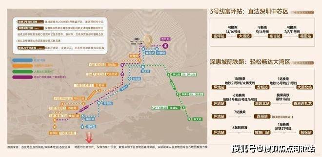 创城云璞交通配套极为完善,地铁3号线东延线富坪站已开通,距离项目仅约200-300米,步行10分钟可达。乘坐3号线到大运站可便捷换乘14号线,30分钟直达福田中心区。深惠城际轨道线坪地站预计2026年11月开通,时速160公里,1站到龙城、2站大运北、6站到深圳北、7站到西丽、10站速达前海,实现"1小时湾区生活圈"。