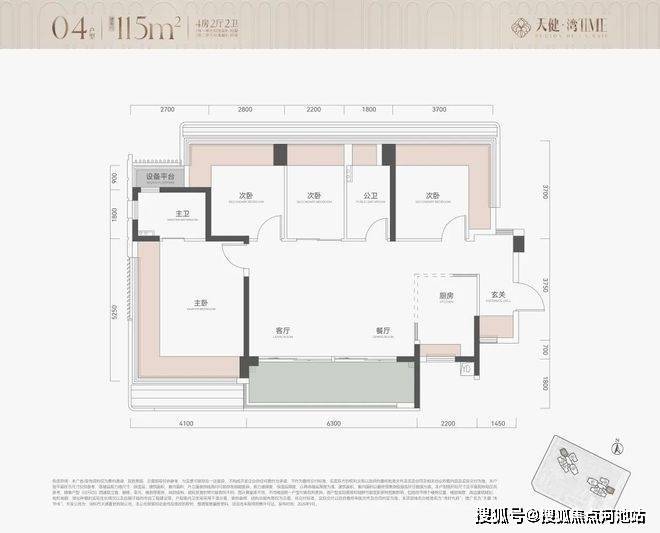 115㎡4房2卫,横厅户型,朝南看海,入户独立玄关,但三个次卧朝北;