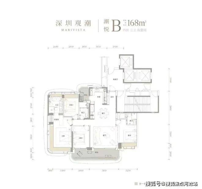 168㎡4房2卫,3梯3户,总价约2200万(单价约13万/㎡)