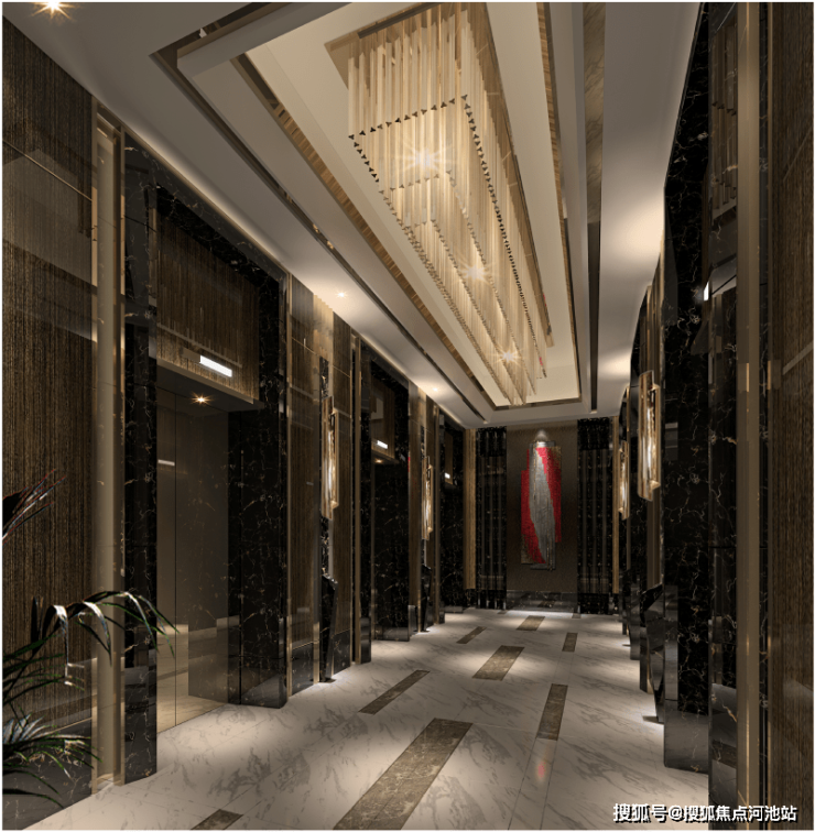 进入大堂电梯厅,迎面而来的是多线条样式的天花板,宛如波光粼粼的湖面,搭配米黄大理石拼花地面。