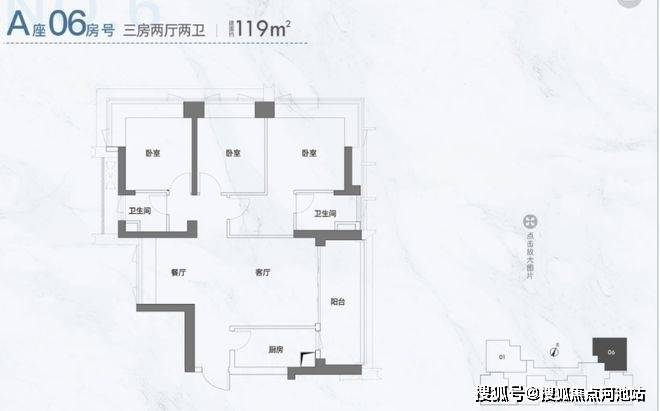 A06户型也是端头户型,三面采光,客餐厅东西通透。客厅、阳台和主卧朝东北,次卧朝西北。这个户型相对来讲,比较方正,但是朝向上东侧有B座的遮挡,有一定的对视
