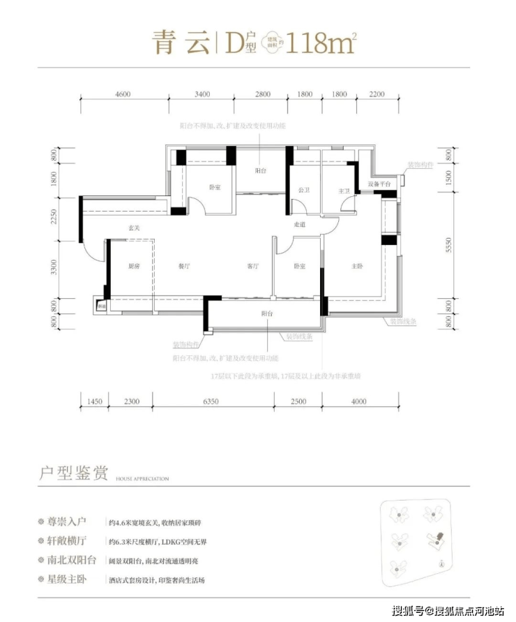 2)建筑面积约118㎡户型,尊崇入户︱约4.6米宽境玄关,收纳居家琐碎,星级主卧︱酒店式套房设计,印鉴奢尚生活场,南北双阳台︱阔景双阳台,南北对流通透明亮,轩敞横厅︱约6米尺度横厅,LDKG空间无界;