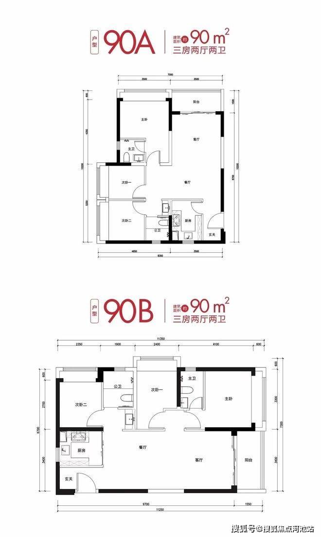 户型:建面约70㎡两房、建面约90㎡三房两卫