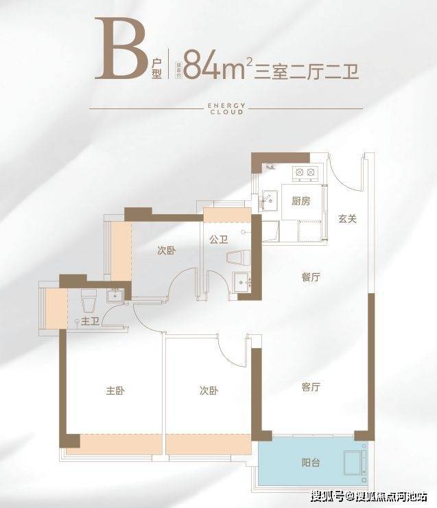 84㎡三房户型,格局跟89㎡的差不多,但跟市场上产品比,同等面积做到了少有的2卫。