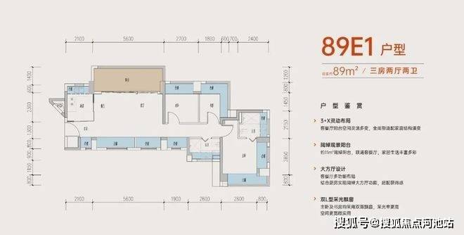 89㎡的3房2厅2卫,E1户型,设计的是横厅南北通透格局,进门入户玄关,客餐厅5.6米开间,LDKB一体化设计,客餐厅出11㎡的大阳台,主卧+1个次卧双飘窗设计,全屋12面飘窗,分别做到了主卧15.1㎡/次卧7.83㎡/次卧6.96㎡(包含墙体飘窗),L型灵动式厨房,卫生间干湿分离,得房率约:77.39%(不含赠送),阳台主朝西北向。也是可以改4房的格局,赠送面积24㎡,加上赠送得房率104.44%。