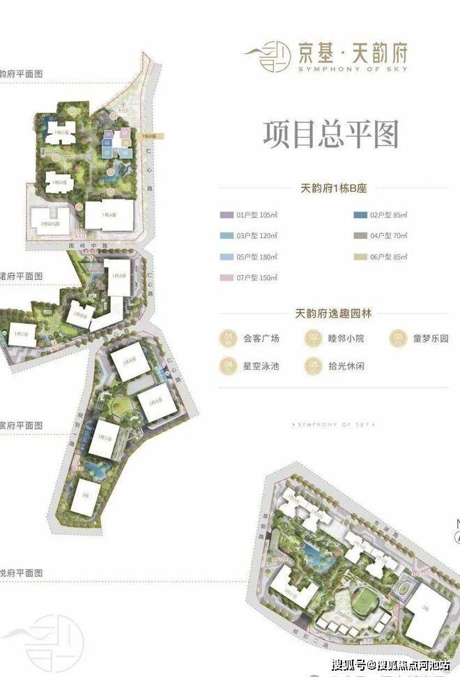 京基天韵府:共由3栋62F的超高层住宅+1栋商办公寓组成,其中1栋A座商办公寓52F,1栋B/C/D座住宅62F,2栋是1所9班制幼儿园。