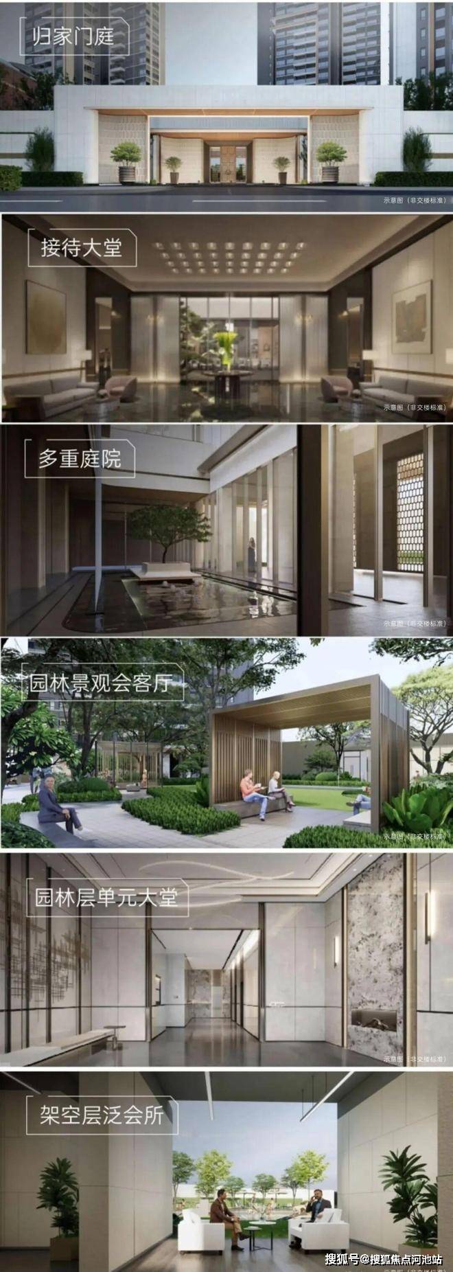 仪式门廊→接待大堂→下沉庭院/会所 →园林景观会客厅→架空层泛会所→ 园林层单元大堂