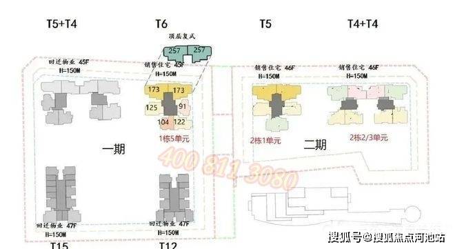 卓越缦悦首推一期1栋5单元(45层),91-173㎡3-4房,共232套,以122-175平米4房为主,占比83%,还有两套257平顶复产品。173/257平大户型双电梯独立电梯厅入户,南区91-125平户型3梯4户。
