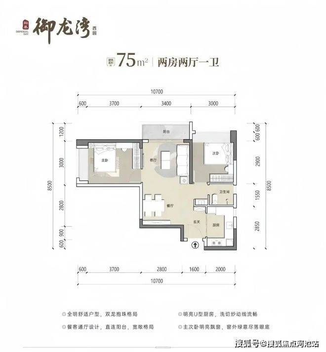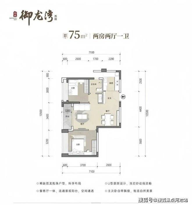75㎡2房1卫,分布在1栋3/4单元03/06户型,设计的是竖厅稀缺的双龙抱珠格局,客厅开间3.4米,U型厨房,卫生间三段式分离设计,得房率约73.26%(不含赠送),东南或西北朝向,加上赠送得房率约80%