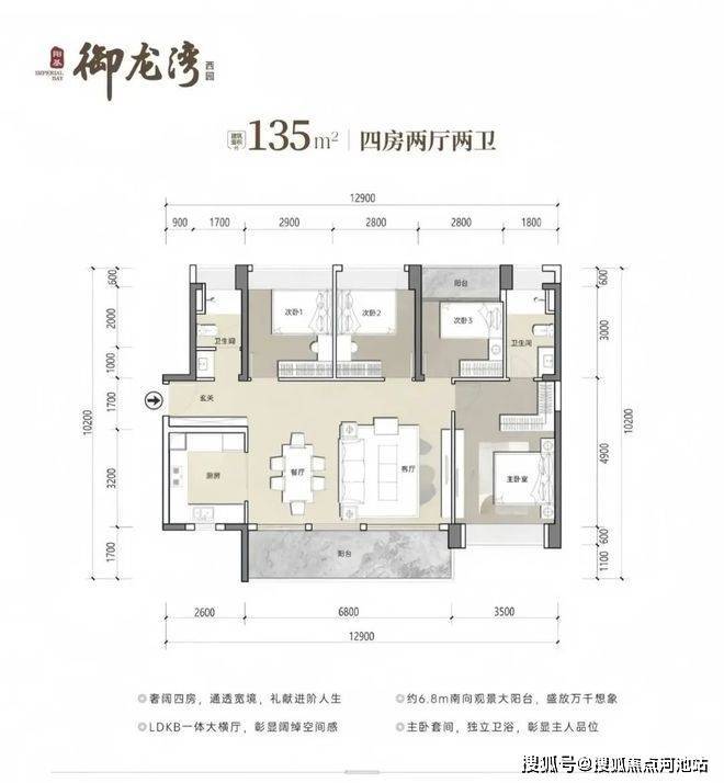135㎡4房2卫,设计的是横厅南北通透格局,客餐厅开间6.8米,LDKB一体化设计,四开间朝南,U型厨房,公卫三段式分离设计,得房率约79.25%(不含赠送),阳台主朝东南或西南向,加上赠送得房率约90%