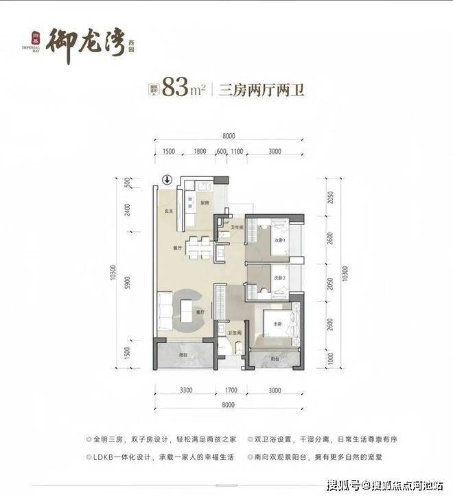 83㎡3房2卫,分布在2栋2单元03/04户型,设计的是竖厅格局,客厅开间3.3米,LDKB一体化设计,三开间朝南,U型厨房,公卫三段式分离设计,得房率约79.25%(不含赠送),东南或西南朝向,加上赠送得房率约89%