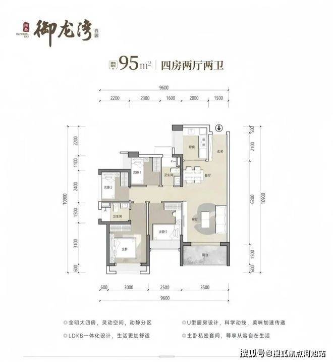 95㎡4房2卫,分布在2栋1单元/3栋03/04户型,设计的是经典竖厅格局,客厅开间3.5米,LDKB一体化设计,三开间朝南,U型厨房,卫生间干湿分离设计,得房率约79.25%(不含赠送),东南或西南朝向,加上赠送得房率约88%