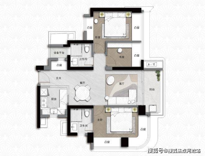 92㎡三房两厅两卫:刚需首选,双龙抱珠格局,动静分区清晰;客厅连接阳台,主卧套房带 270° 环幕飘窗,得房率约 90%,适合深港通勤刚需家庭。