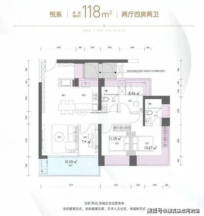 118㎡的4房2厅2卫,1栋2单元02户型,设计的是竖厅格局,进门约6.12平的入户玄关位,客厅3.5米开间,LDKB一体化设计,四开间朝南,动静分区,分别做到了主卧15.67㎡/次卧11.35㎡/次卧8.46㎡/次卧7.4㎡(包含墙体飘窗),客厅连接次卧出5.75米长的大阳台约10.35平,U型厨房,公卫三段式干湿分离,得房率约96.5%(包含赠送),东南朝向。这个户型区别之处在于公卫,卧室,飘窗赠送面积14.31㎡+阳台赠送面积5.17㎡=实际赠送19.48㎡。