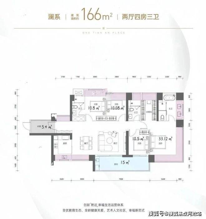 166㎡的4房2厅3卫,1栋2单元01户型,设计的是横厅南北通透格局,独门独户,赠送约5.4平的入户空间,客餐厅7.5米开间,LDKB一体化设计,五开间朝南,主卧带大衣帽间,双套间设计,分别做到了主卧33.12㎡/次卧10.8㎡/次卧10.5㎡/次卧10.08㎡(包含墙体飘窗),客厅连接次卧出7.5米长的大阳台约15平,U型厨房,卫生间干湿分离,得房率约100.24%(包含赠送),西南或东南朝向。飘窗赠送面积20.7㎡+阳台赠送7.5㎡+外廊赠送5.4㎡=实际赠送33.6㎡。