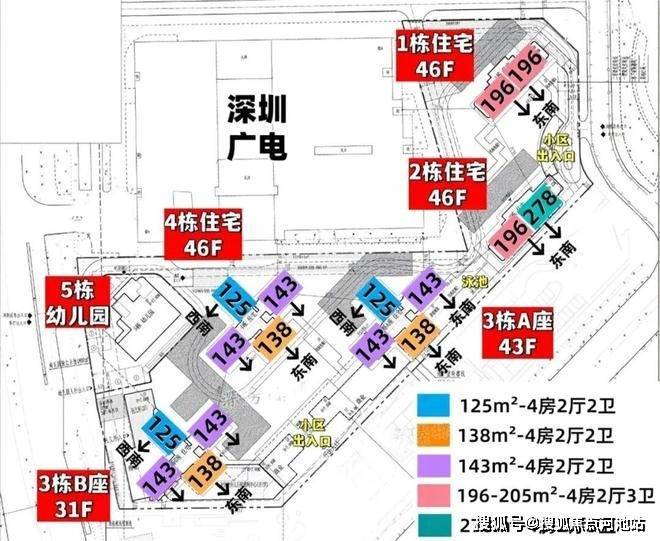 龙岗中海大运玖章花园规划建设五栋高层及超高层住宅。分别为1-4栋,3栋又分为A、B两座。整个项目由于被分为两个不规则的小地块。基于地块形状,大运玖章花园将1栋、2栋分布在较小的北地块,并且都是46层的超高层,户数则是一层两户。