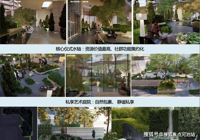 项目利用裙房屋顶打造拥有“仪式水轴“艺术庭院”“空中浮岛森林”三级景观设计的空中庭院,四栋住宅均漂浮于甲板之上,独享甲板庭院花园,以“海风吹拂下的豪宅底盘”托举城市上空的豪宅群落,形成立体景观系统。