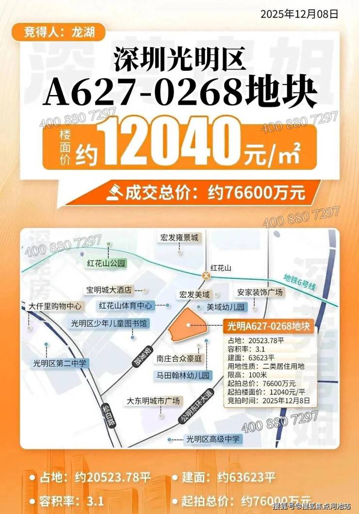 龙湖观萃苑地块(A627-0268)于2025年12月8日深圳集中土拍中成交,楼面价仅约1.2万元/㎡,远低于周边同类型地块价格。该地块位于光明区公明街道核心地段,紧邻红花山公园,属于光明科学城产业转化区辐射范围内。