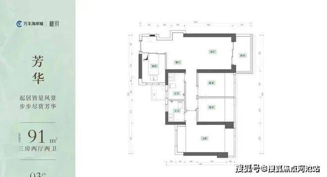 91㎡的3房2厅2卫,设计的是竖厅格局,客厅3.35米开间,LDKB一体化,S墙设计预留冰箱卡槽位,动静分区,U型厨房,公卫干湿分离,得房率约94%(包含赠送),阳台5.7m²东北朝向。赠送面积约11.27m²。