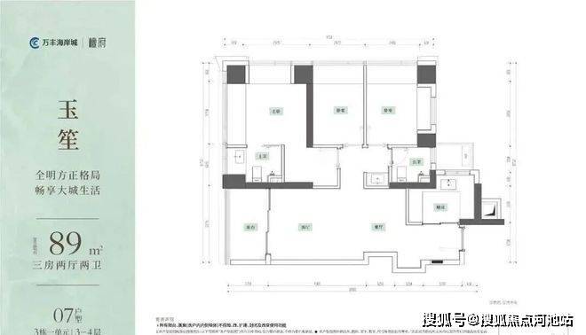 89㎡的3房2厅2卫,设计的是竖厅格局,客厅3.375米开间,LDKB一体化,S墙设计预留冰箱卡槽位,三开间朝南,动静分区,U型厨房,公卫三段式干湿分离,得房率约95%(包含赠送),阳台5.9m²西南朝向。赠送面积约14.69m²。