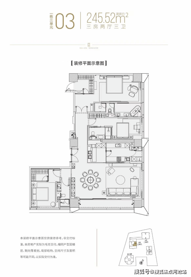 公寓有245-337㎡ 3-4房 665㎡顶复;一栋二单元为住宅项目,59层高,4梯6户,46-56层2梯2户;三单元为公寓,共41层,公寓2梯3户。