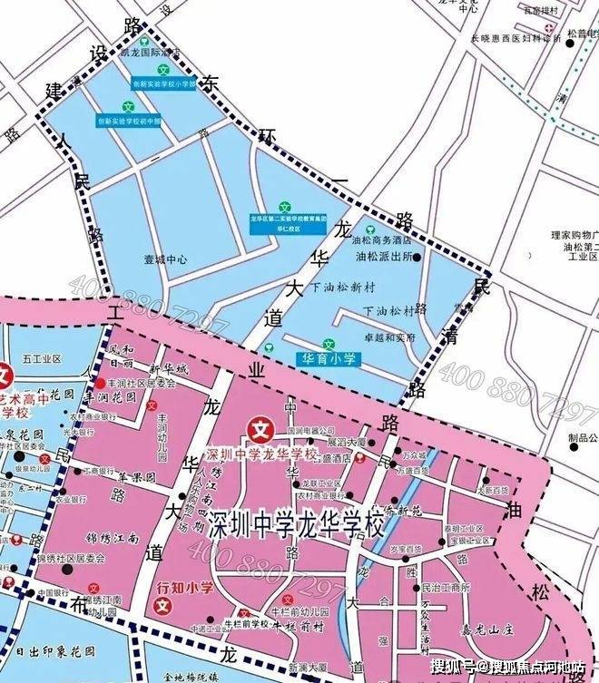 划分范围:民治街道(除单校划片学区外)和龙华街道东环一路以南、民清路以西、工业路以北、人民路以东、建设路以东(蓝色虚线框)范围。