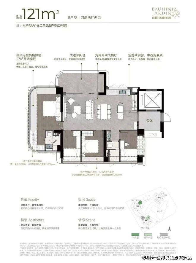 121㎡的4房2厅2卫,设计的是横厅南北通透格局,专梯入户有独立公区,客餐厅7.15米开间,LDKB一体化设计,动静分区,主卧大套间无柱弧形270°转角飘窗,客厅大进深阳台,洄游式中西厨房,公卫三段式分离,得房率约92-100%(包含赠送),阳台主朝西南或东南向。