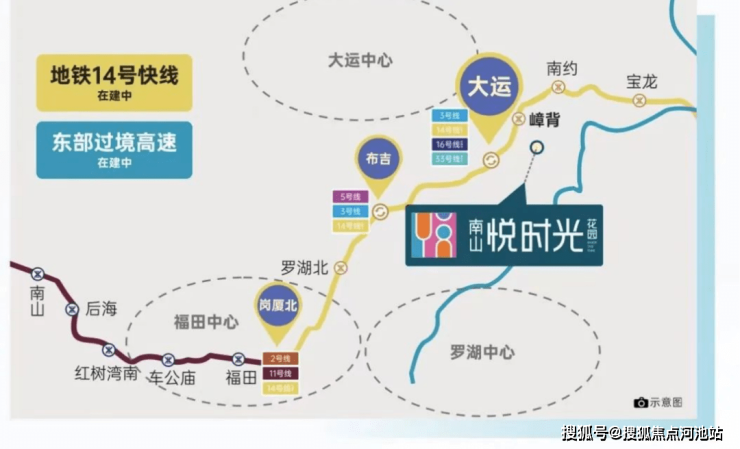 南山悦时光花园14号地铁快线(已通车),项目毗邻嶂背地铁站,未来可实现1站大运,8站福田,畅享大运中心丰富商业文体配套。周边城市快速路网发达,其中东部过境高速已通车,未来直抵罗湖。“一芯两核多支点”发展战略,以大运深港国际科教城为“智芯”,以宝龙科技城为代表的低碳智造核和信息数字核为“东西双核”。大运—宝龙互联互通、融合发展,打造深圳东部科研创新智造高地。