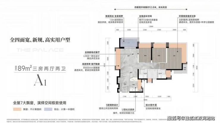 亮点1:客厅270度采光设计,客厅更是采用了当下最流行的设计风格「无主厅化」,而且客厅的凸窗进深达到了80CM。