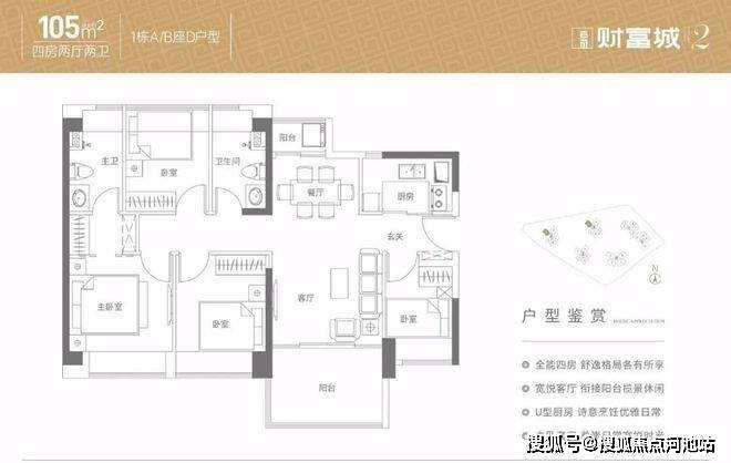 105㎡的4房2厅2卫,折后总价345-372万/套,单价3.28-3.54万/㎡。