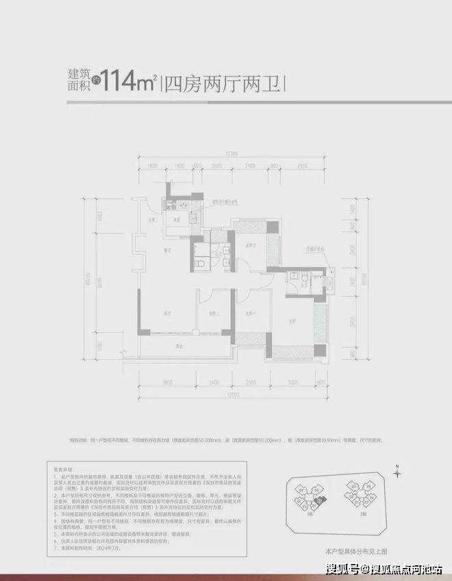 -114㎡的4房2厅2卫,设计的是经典竖厅格局,客厅3.8米开间,进门独立玄关,LDKB一体化设计,S墙设计预留冰箱卡槽位,4个卧室分别做到了3.8米/3.2米/2.55米/2.44米的宽度,U型厨房,公卫三段式分离设计,得房率约:95%(包含赠送),客厅连接次卧出6.2米的大阳台,朝东南向。