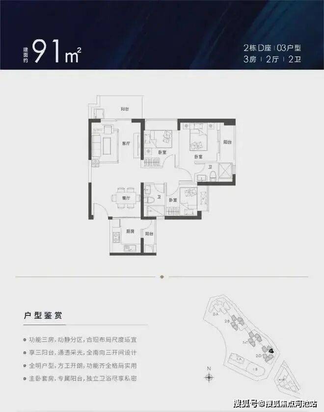 91㎡的3房2厅2卫,设计的经典竖厅格局,客厅主卧双阳台设计,厨房也带小阳台,三开间朝南,客厅朝西南向,有1个2栋D座03户型非常类似,客厅朝东北向。