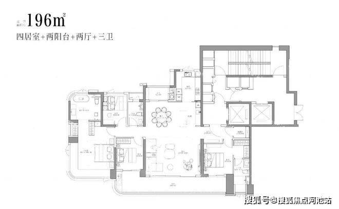 较大的南地块,则排布了3栋A、B座以及4栋。这里边3栋A座43层,3栋B座31层,4栋46层。四栋楼均是一层四户的设计。