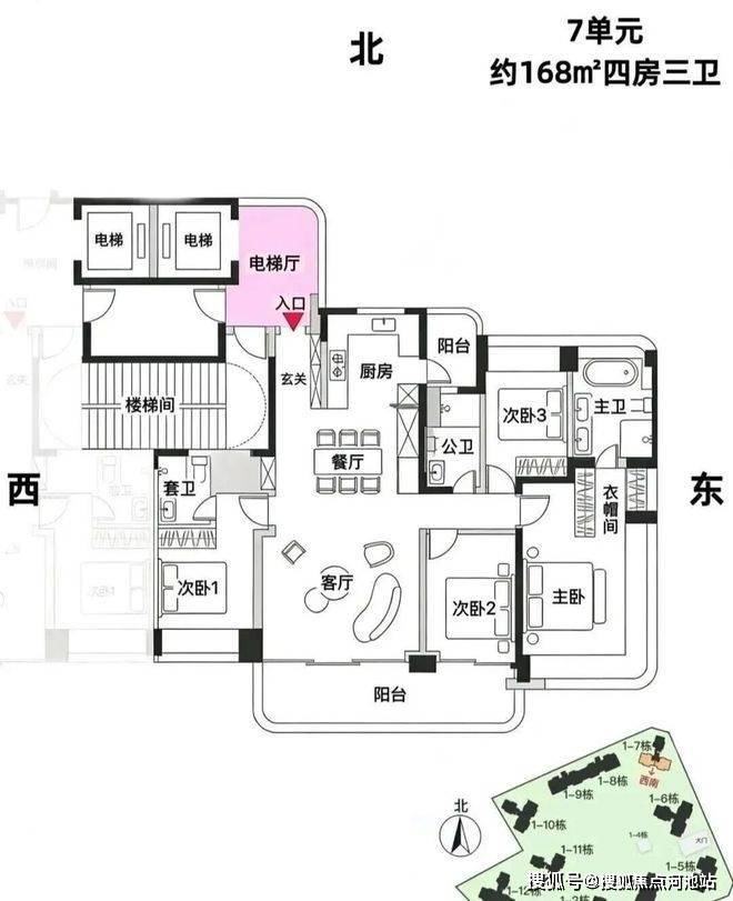最低楼层22层,最高24层,楼层分布每楼层2-3户;地下1层,采用架空车库方式抬高地势。整体将打造约20来层的高层社区,规划容积率仅3.4,小区呈围合排布,居住密度较低。