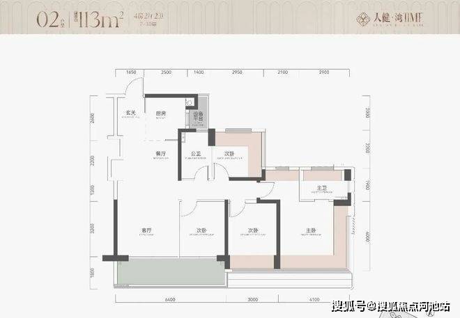 113㎡四房两卫是入门首选,采用竖厅设计,南北通透,6.4米宽大阳台连接客厅与次卧。户型动静分区明确,主卧带独立卫浴和飘窗,实际使用面积接近120㎡,空间利用率极高。这个户型4开间朝南,南向面海,是上车门槛最低的户型。