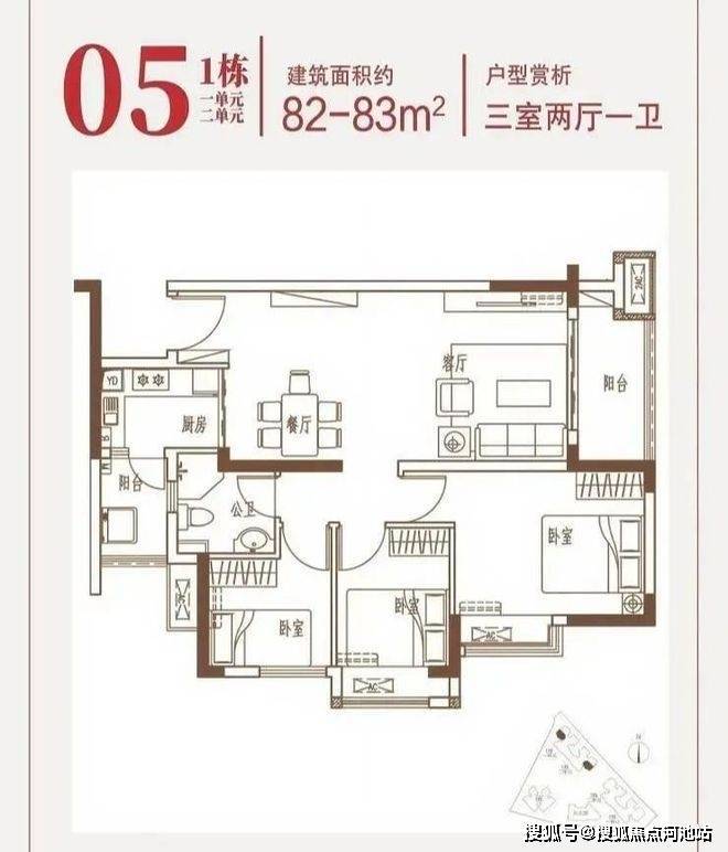 82-83㎡三房两厅一卫:全明通透设计,南北双阳台(景观阳台进深 1.8 米,生活阳台进深 1.2 米),实现穿堂风效果。