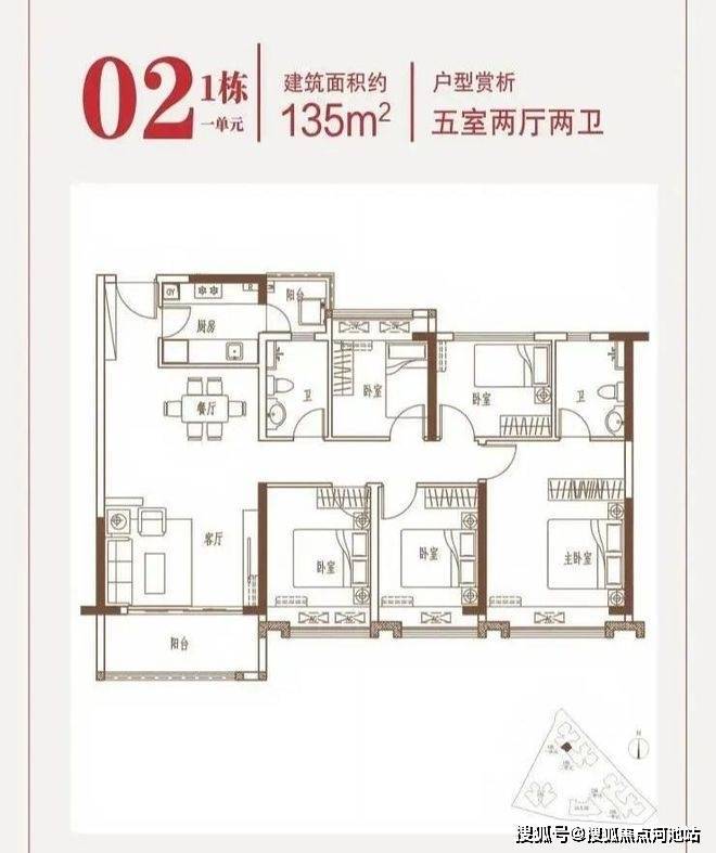 135㎡五房两厅两卫:南北通透设计,5.1 米开间横厅连接 10.8㎡景观阳台,形成家庭核心活动区;卧室集中于西侧,实现动静分区。