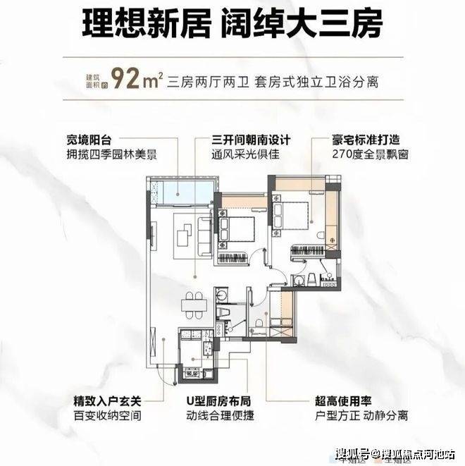 92㎡的3房2厅2卫,设计的是经典竖厅格局,客厅实测3.25米开间,LDKB一体化设计,三开间朝南,分别做到主卧15.32m²/次卧9.15m²/次卧5.57m²(实测面积),主卧270°转角飘窗,L型厨房,公卫三段式分离,得房率:76.44%(不含赠送),西南或东南朝向。