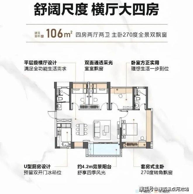 106㎡的4房2厅2卫,设计的是横厅南北通透格局,进门独立入户玄关,客餐厅6.1米开间,LDK一体化设计,分别做到主卧17.31m²/次卧7.75m²/次卧7.41m²/次卧6.92m²(实测面积),主卧270°转角飘窗,U型厨房,公卫三段式分离,得房率:76.44%(不含赠送),阳台主朝西南或东南向。