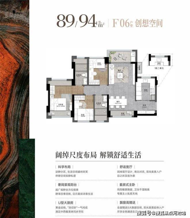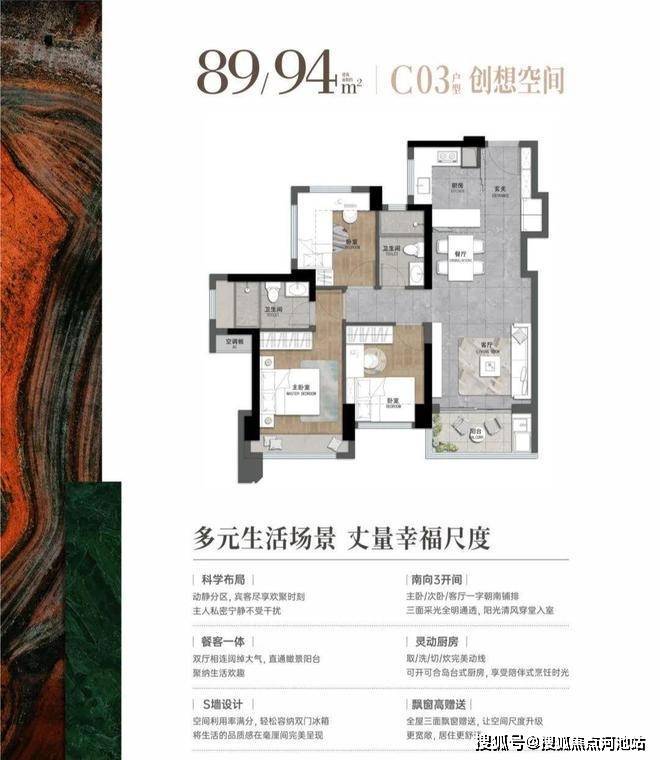 89-94平:3房2厅2卫,套内净使用率在80%,东南朝向