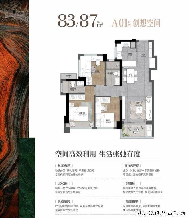 83-87平:3房2厅2卫,套内净使用率在80%,西南朝向