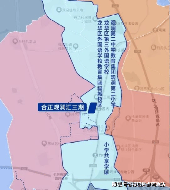 观澜第二小学、观澜第二中学、龙华区第三外国语学校,项目后期规划九年一贯制教育用地和幼儿园用地。